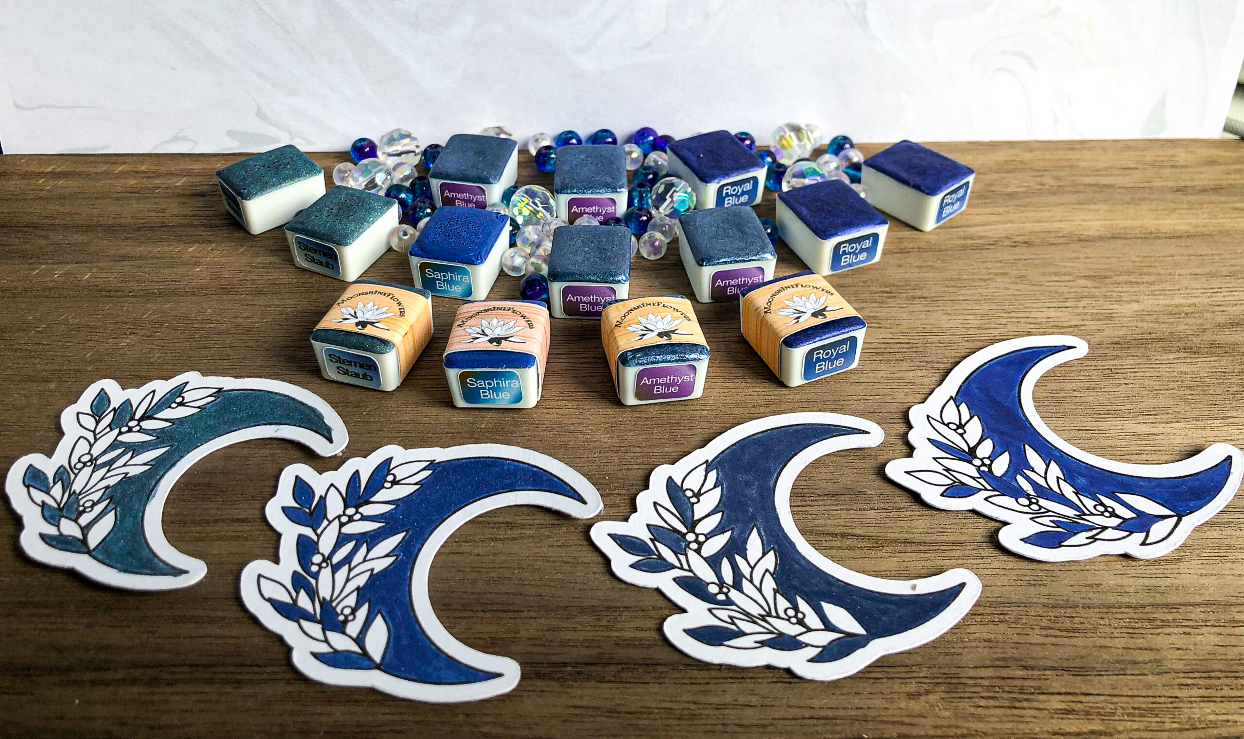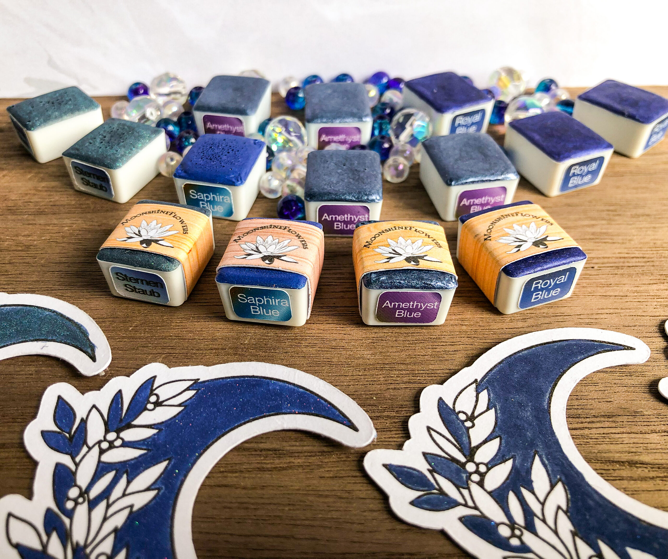 Die Farben kommen sicher verpackt in halben Näpfchen (Half Pans) ,viertel Näpfen (quarter Pans) Mini-Pans oder Mondperlen zu dir, bereit für dein nächstes Kunstwerk!